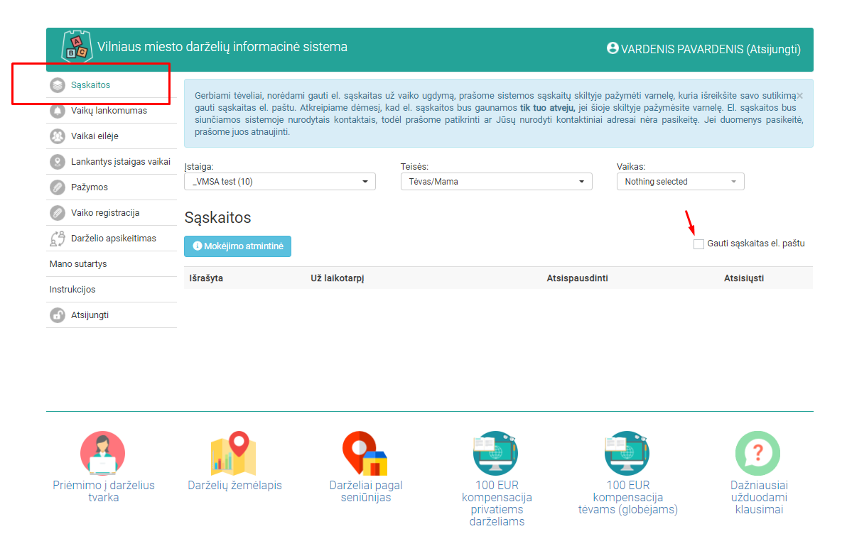 Vilniaus miesto darželių informacinės sistemos skiltyje „Sąskaitos“ reikia pažymėti varnelę, kuria tėvai išreikš savo sutikimą gauti sąskaitas už ugdymą elektroniniu paštu.